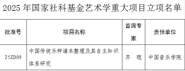 近日,全国艺术科学规划领导小组办公室正式公布2025年度国家社科基金艺术学重大项目立项名单,我校齐琨教授作为项目首席专家主持的《中国传统乐种谱本整理及其自主知识体系研究》(项目编号:25ZD09)获批立项。